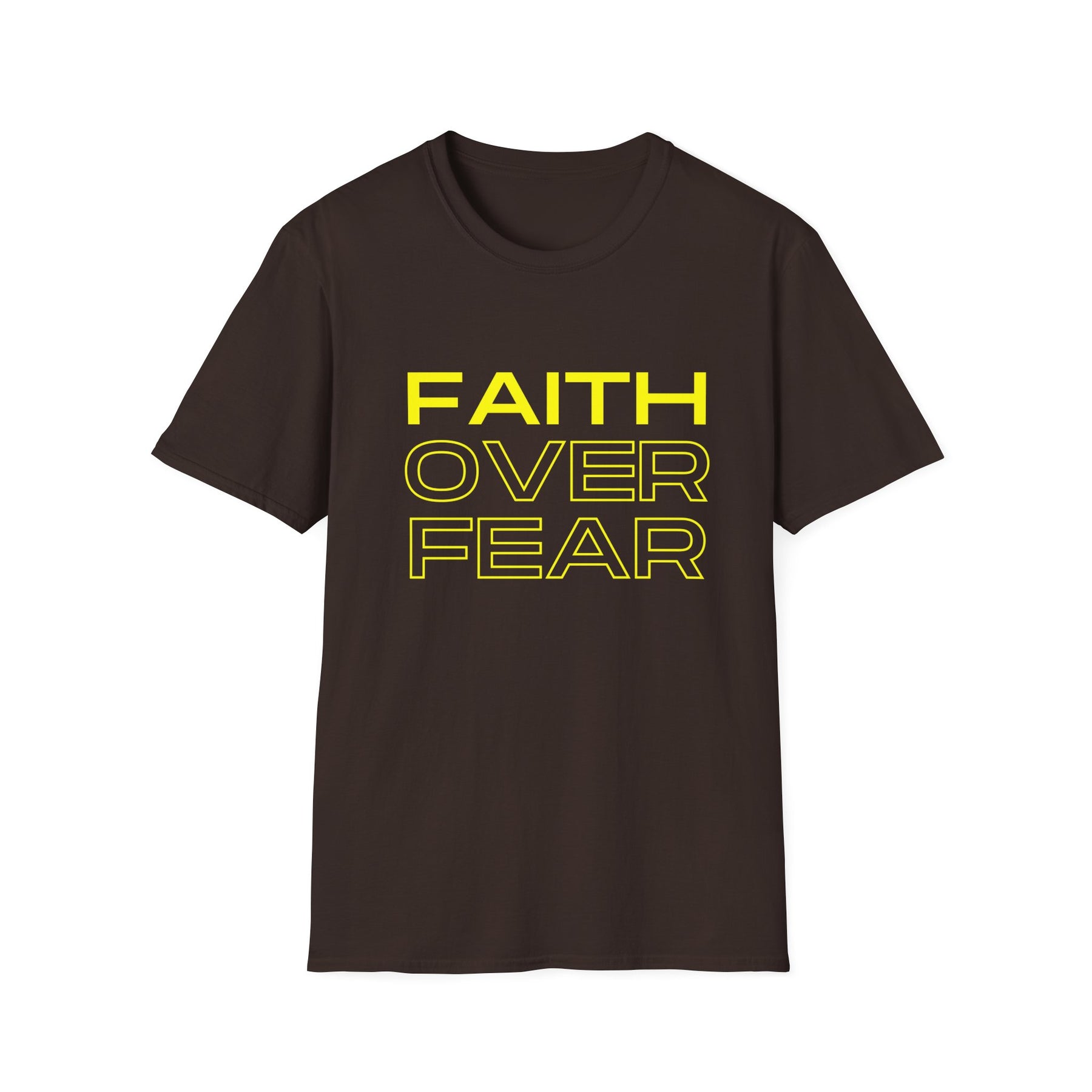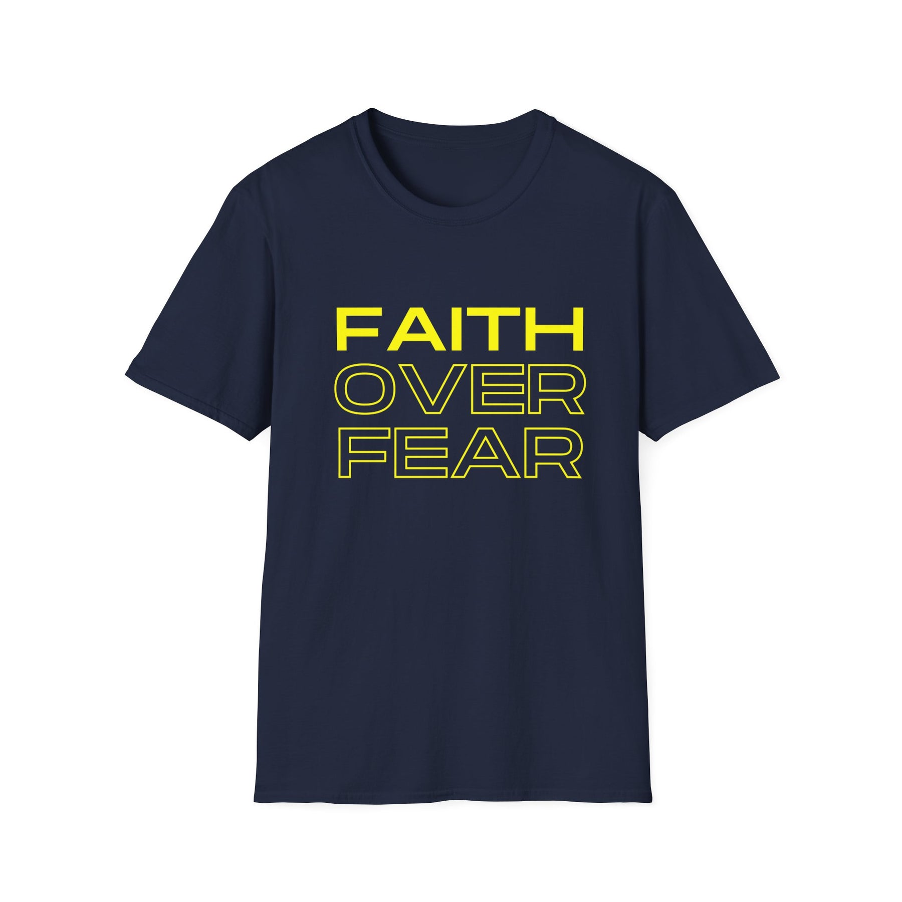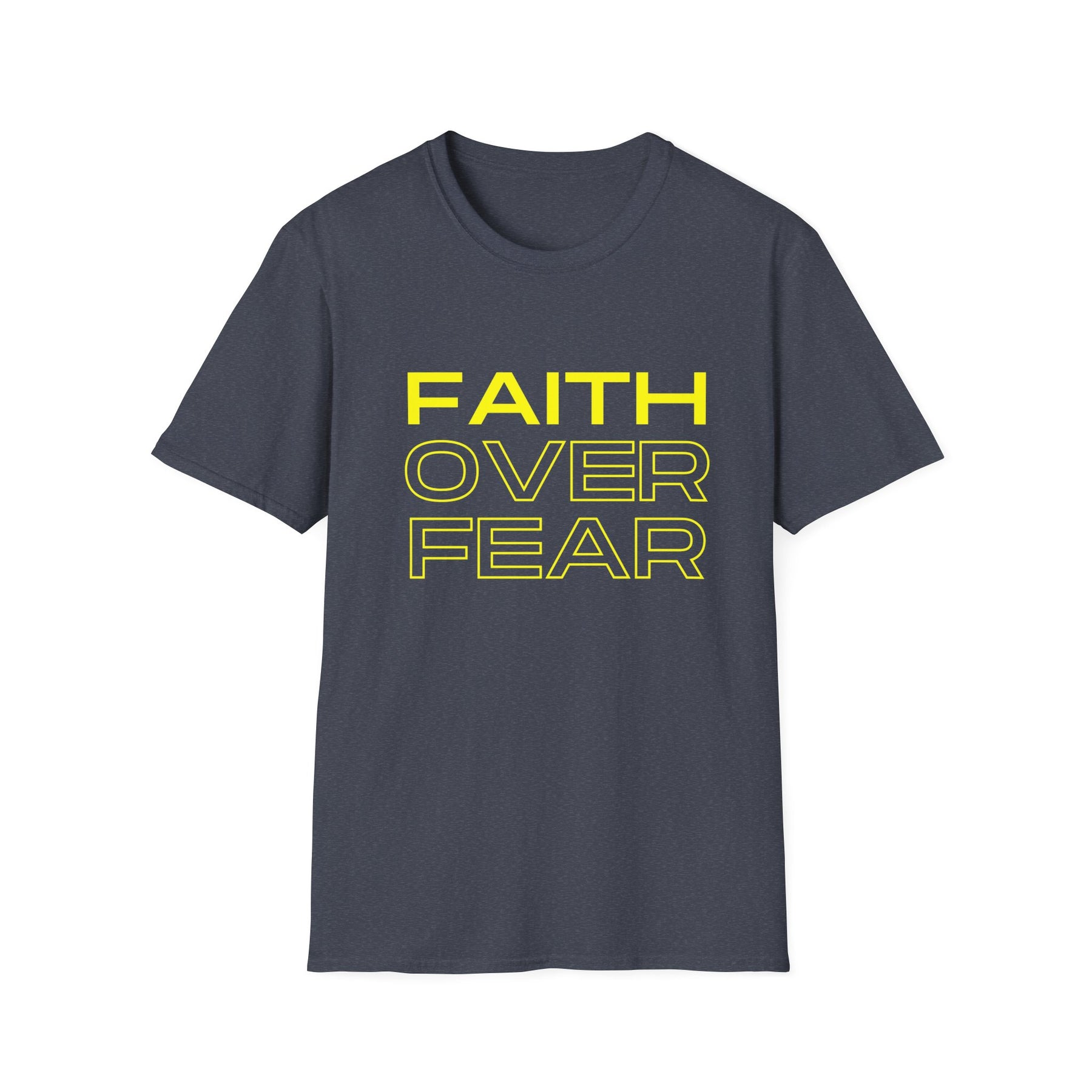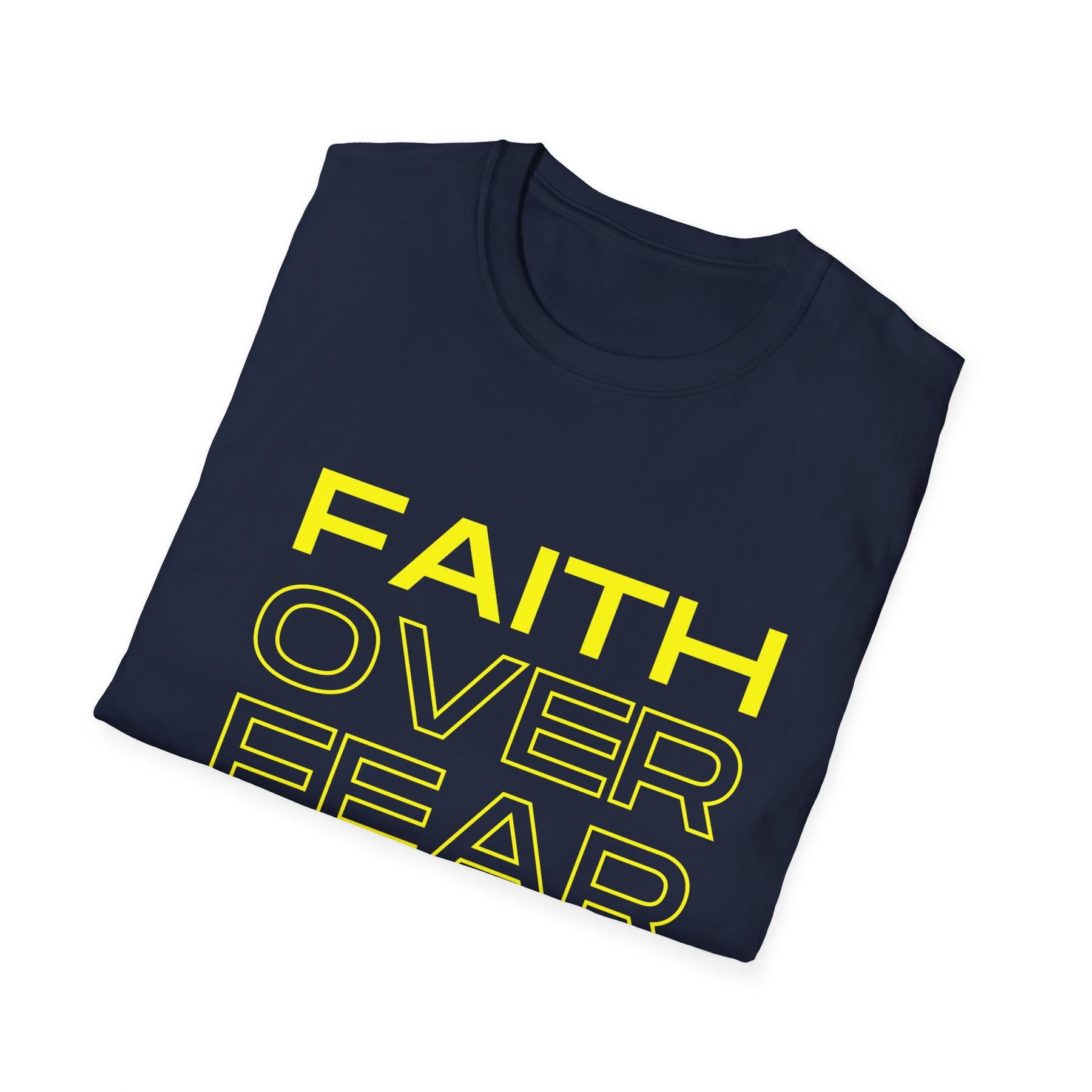 Bold and straightforward—this tee wears its heart on the chest. A crisp, modern type treatment reads FAITH OVER FEAR in high-contrast yellow on a classic black crew, making a quiet declaration that carries through everyday life. Lightweight, soft ring-spun cotton drapes comfortably whether you’re heading to a morning meet-up, church small group, or an evening walk with friends. The clean silhouette pairs easily with jeans, a denim jacket, or under a blazer for a layered look that’s both confident and calm. Wear it when you need a gentle reminder to choose trust over doubt; it speaks without shouting and fits right into routines that value purpose and presence.